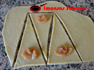 - Abrir a massa bem fininha, cortar retângulos, colocar uma colherzinha de café de geleia e enrolar.