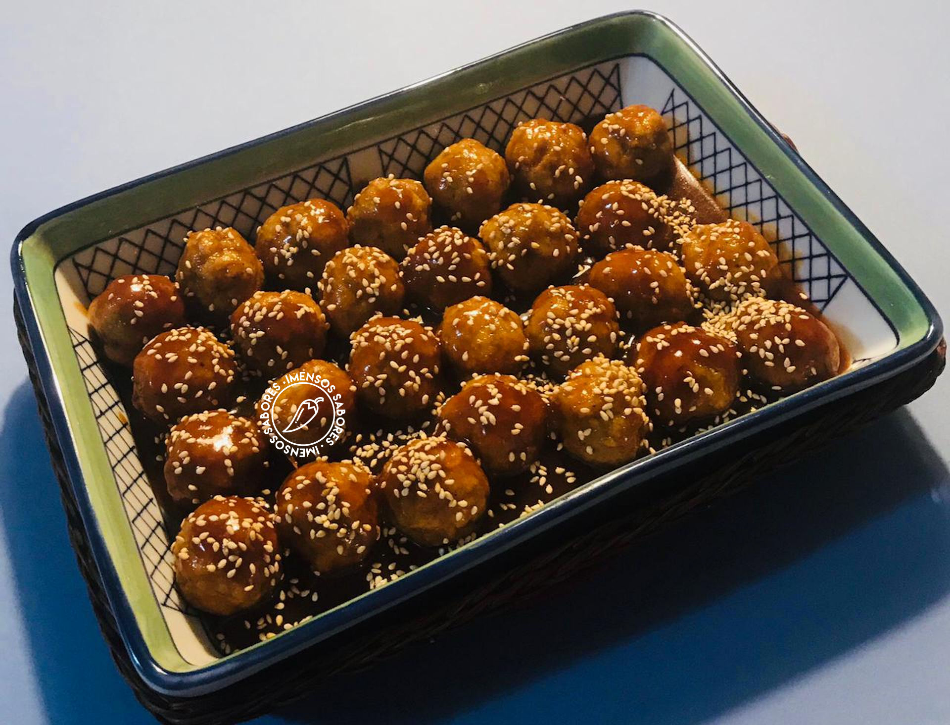 - Colocar todos os ingredientes no molho em uma panela wok. Levar ao fogão em temperatura baixa até o molho engrossar um pouco. Juntar as almôndegas e misturar delicadamente. Colocar em recipiente de ir a mesa. Polvilhar as sementes de sésamo. Servir.