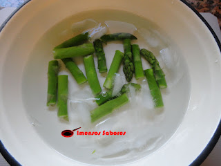- Quando a água ferver juntar um pouco de sal e acrescentar os aspargos. Deixar cozer até estar al dente. Retirar da água e colocar no recipiente com a água gelada, assim vai parar o cozimento e realçar a cor. Retirar da água. Reservar.