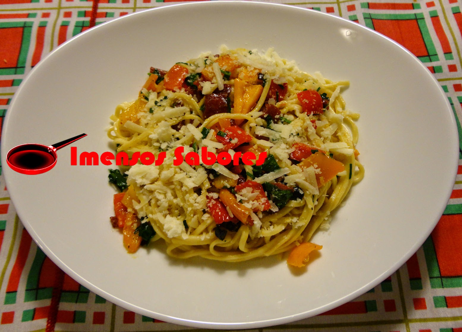 - Quando o macarrão estiver cozido al dente escorra a água e junte na panela com o preparado de pimentões e chouriço, acrescente as ervas e misture. Servir.