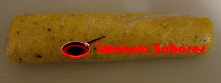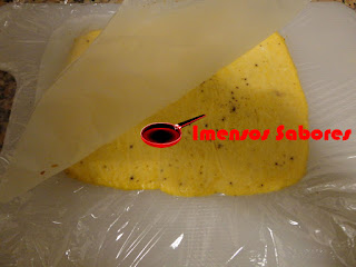 4. Entretanto cobrir uma tábua com a película e quando o omelete estiver cozido desliza-lo para a tábua e deixar coberto com o papel vegetal. Reservar.