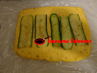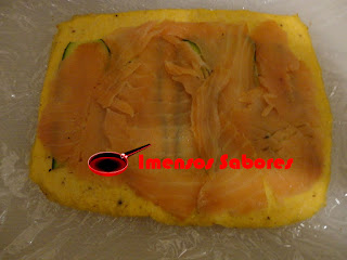 - Untar com azeite uma frigideira antiaderente e levar a fogo com chama alta. Grelhar as fatias de courgette dos dois lados. Colocar sobre o omelete. A seguir colocar fatias do salmão sobre as fatias de courgette. Fazer um rolo com o auxílio da película. Deixar repousando por no mínimo 30 minutos.
