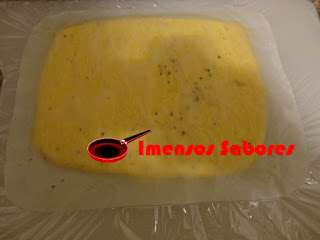 - Entretanto cobrir uma tábua com a película e quando o omelete estiver cozido desliza-lo para a tábua e deixar coberto com o papel vegetal. Reservar.