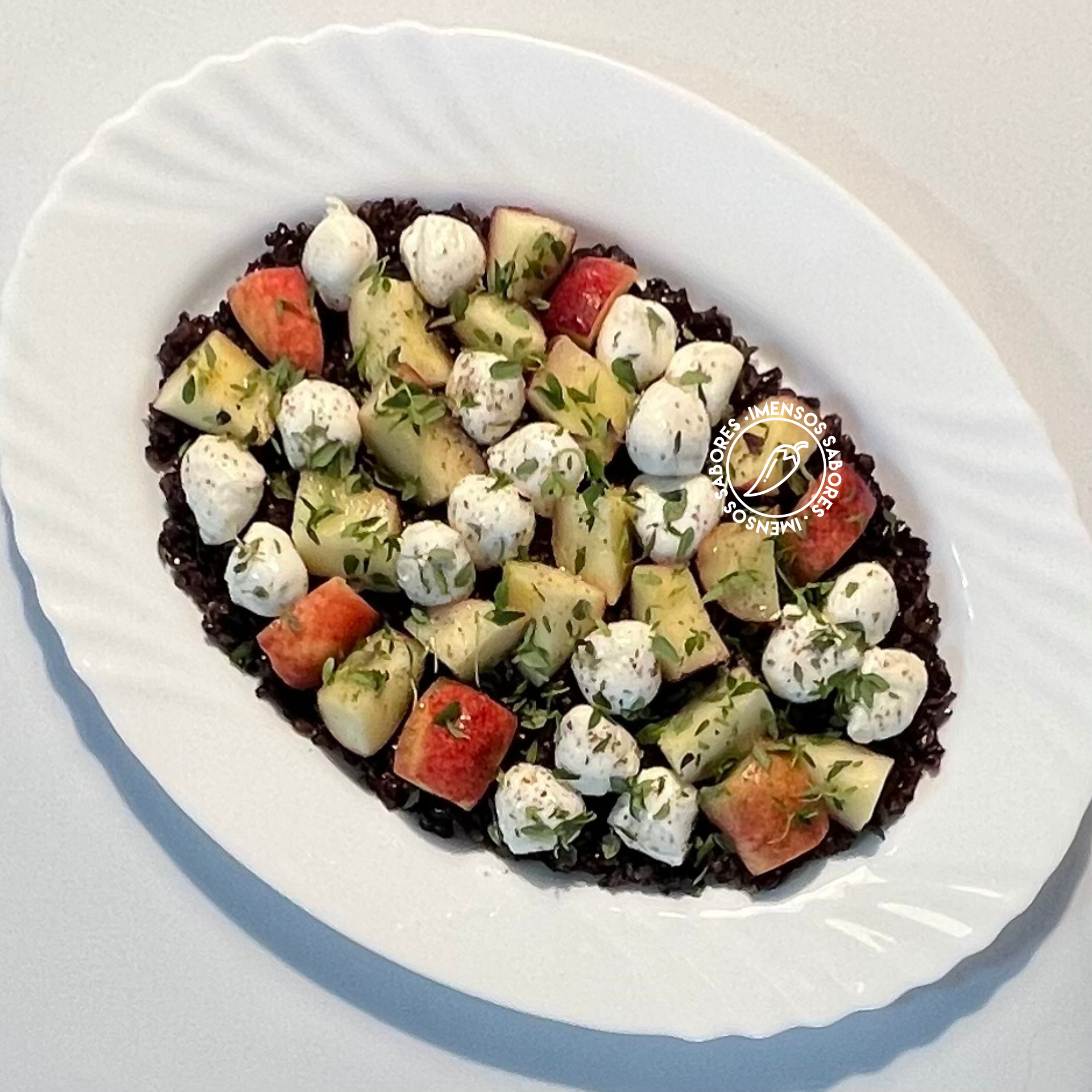 - Na mesma tigela em que temperou o arroz colocar a mozarela, temperar com a mistura de grãos de pimentas e azeite. Reservar.