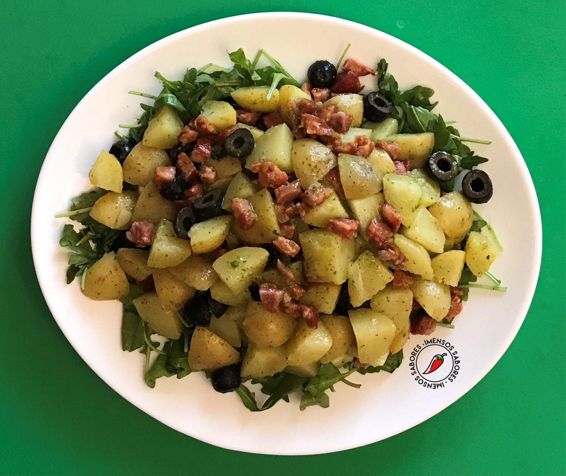 - Temperar (a gosto) com o molho as batatas com o chouriço e azeitonas. Colocar sobre a rúcula. Servir.