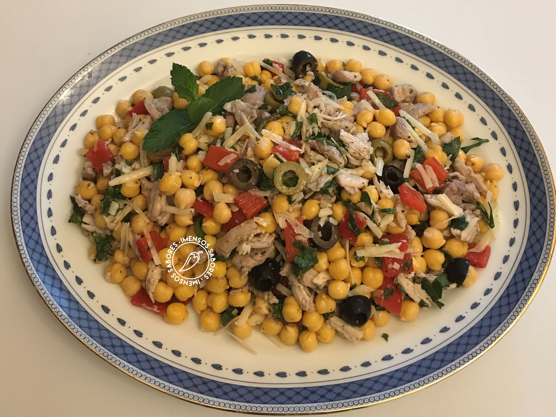 - Colocar em uma tigela o grão, o frango, o pimentão, as azeitonas, salsa e hortelã. Temperar com sumo de limão, azeite e pimenta. Misturar. Acrescentar o queijo. Misturar. Experimentar para ver a necessidade, ou não, de acrescentar sal. Colocar em uma travessa. Servir.
