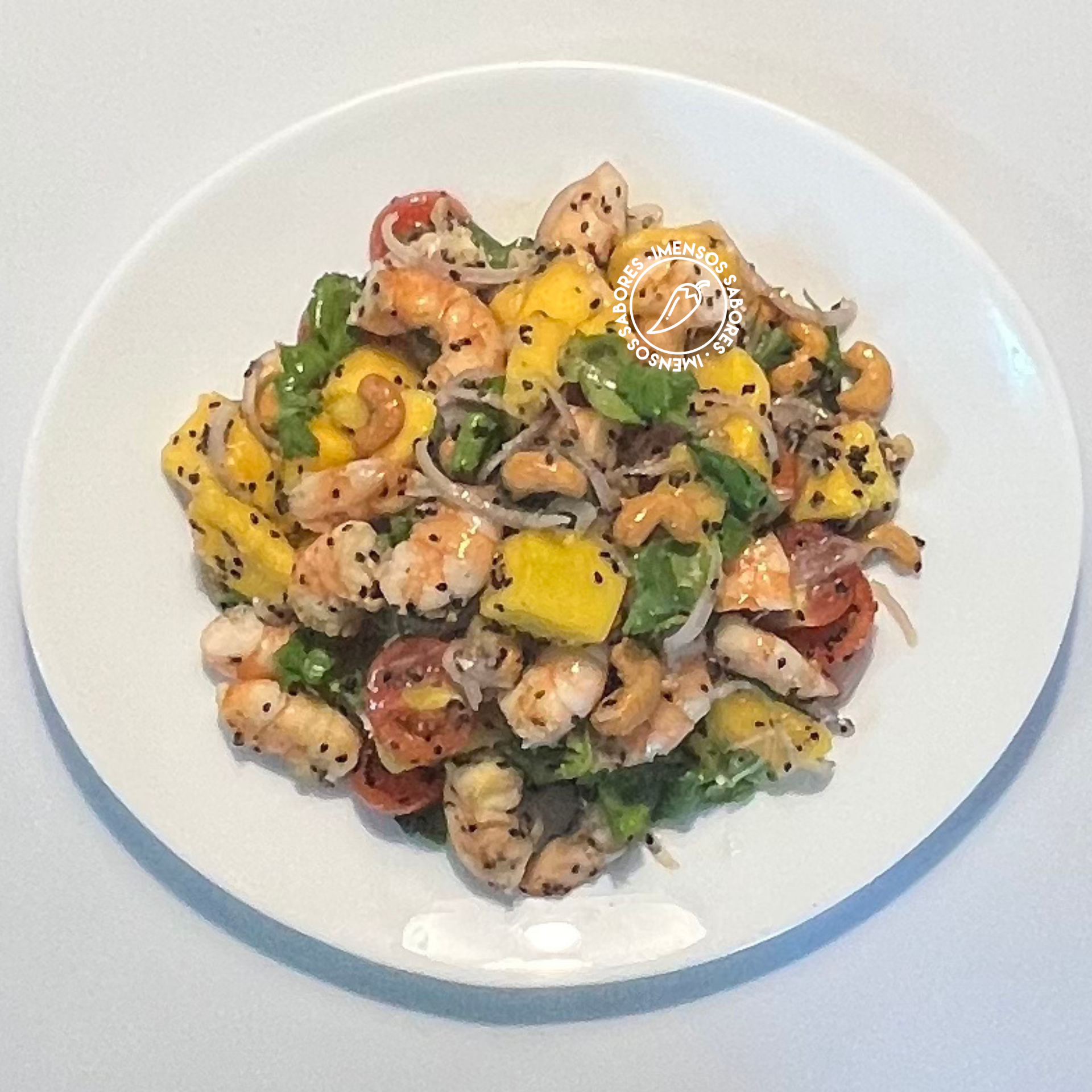3. Colocar em uma tigela a manga, os tomates, a chalota, o restante das sementes de sésamo e a castanha de caju. Acrescentar o azeite de oliva, sumo de limão e o molho de pimenta. Temperar à gosto com sal (pouco). Misturar.
