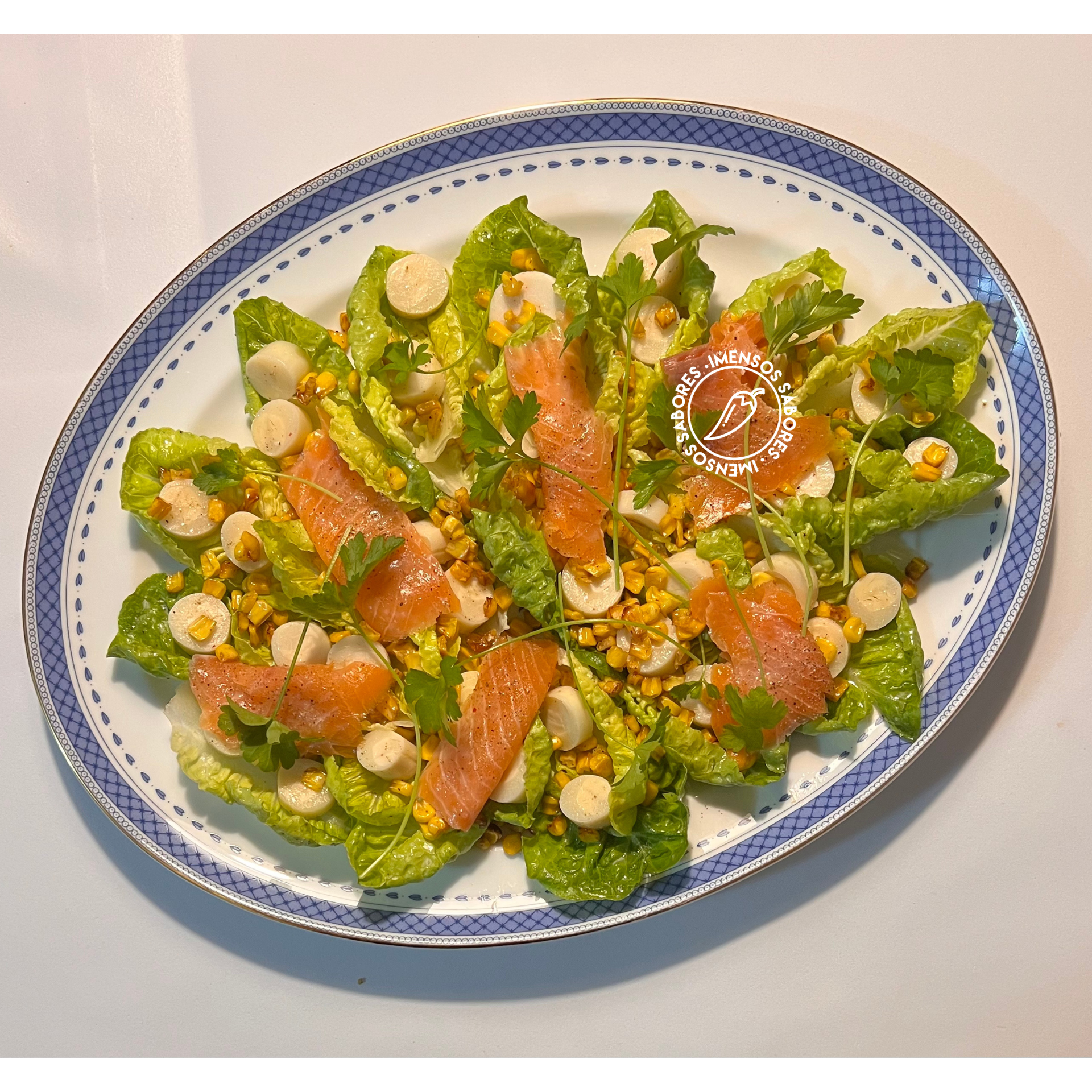 - Temperar a alface com sal, mistura de grãos de pimentas, sumo de limão e azeite. Dispor em uma travessa grande. Reservar.