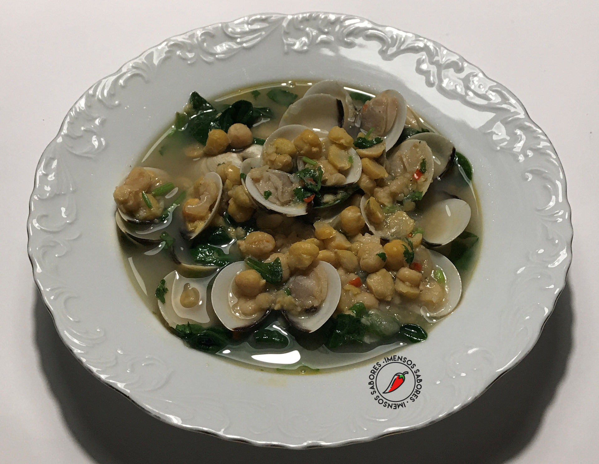 3. Escorrer as amêijoas da água com sal, juntar na panela e cozinhar até abrir, cerca de 5 minutos. Desligar o fogo. Juntar o espinafre e os coentros. Misturar. Servir.