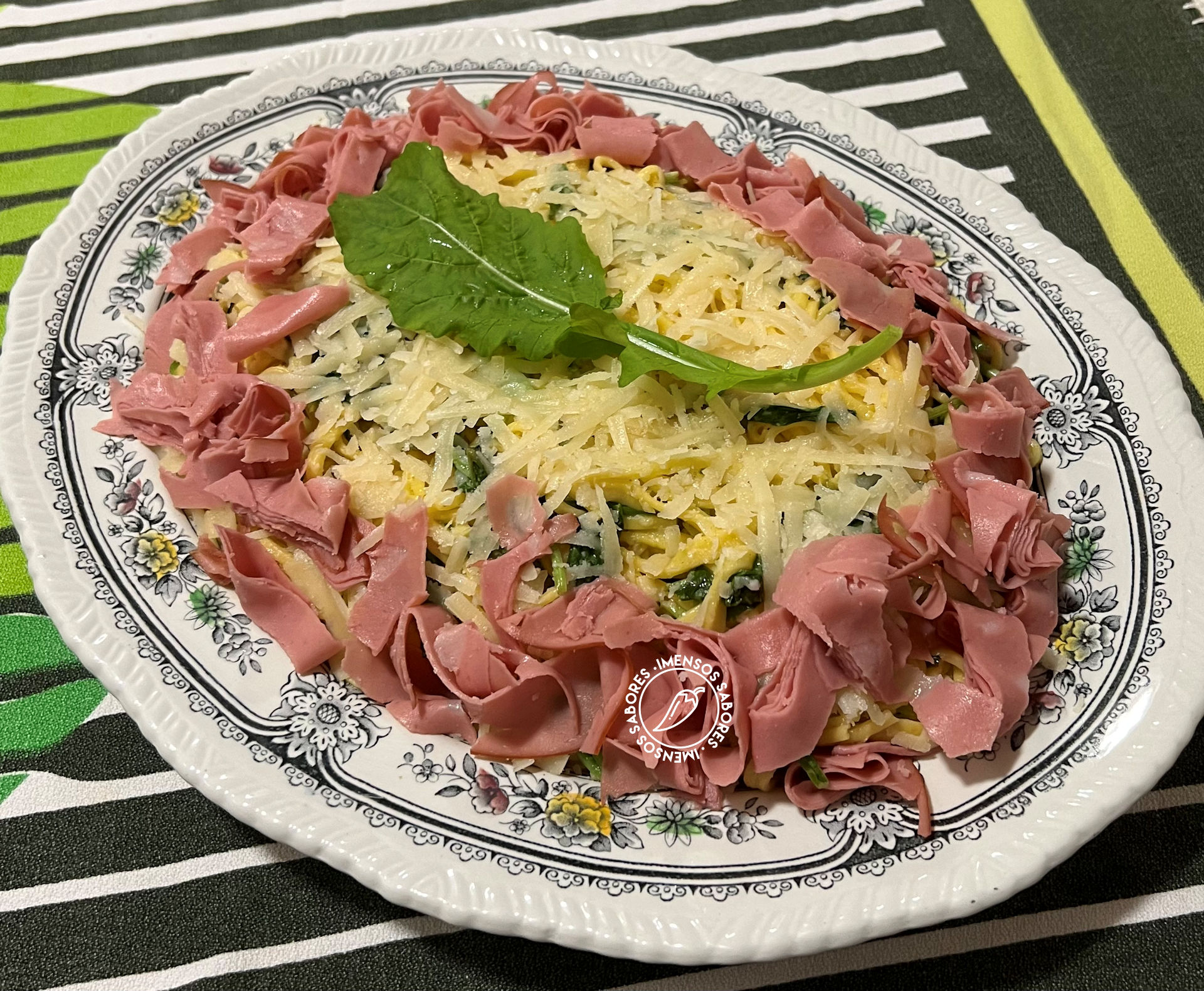 - Colocar a massa em recipiente de ir a mesa. Espalhar o queijo por cima. Juntar a mortadela. Servir.