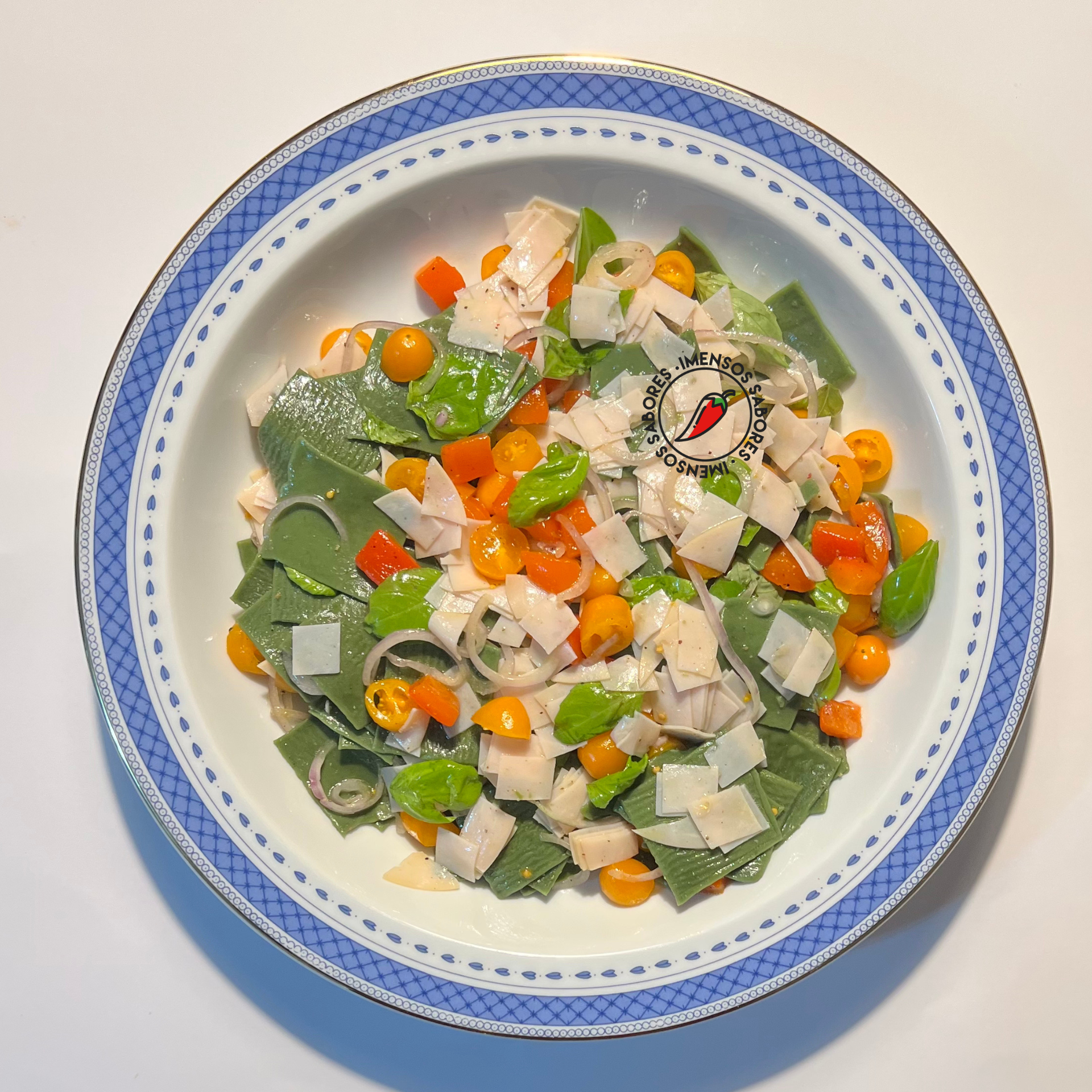 Salada de macarrão caseiro com espirulina e fiambre (presunto) de frango
