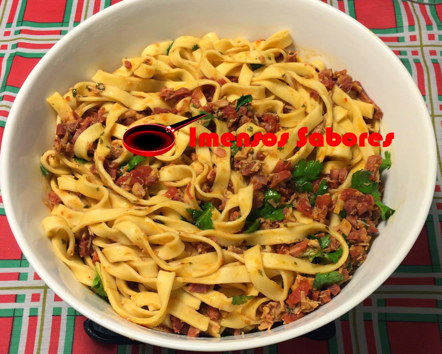 - Cozinhar a massa (al dente) em bastante água fervente com sal. Escorrer a água, juntar o molho, acrescentar as folhas de coentro. Servir.